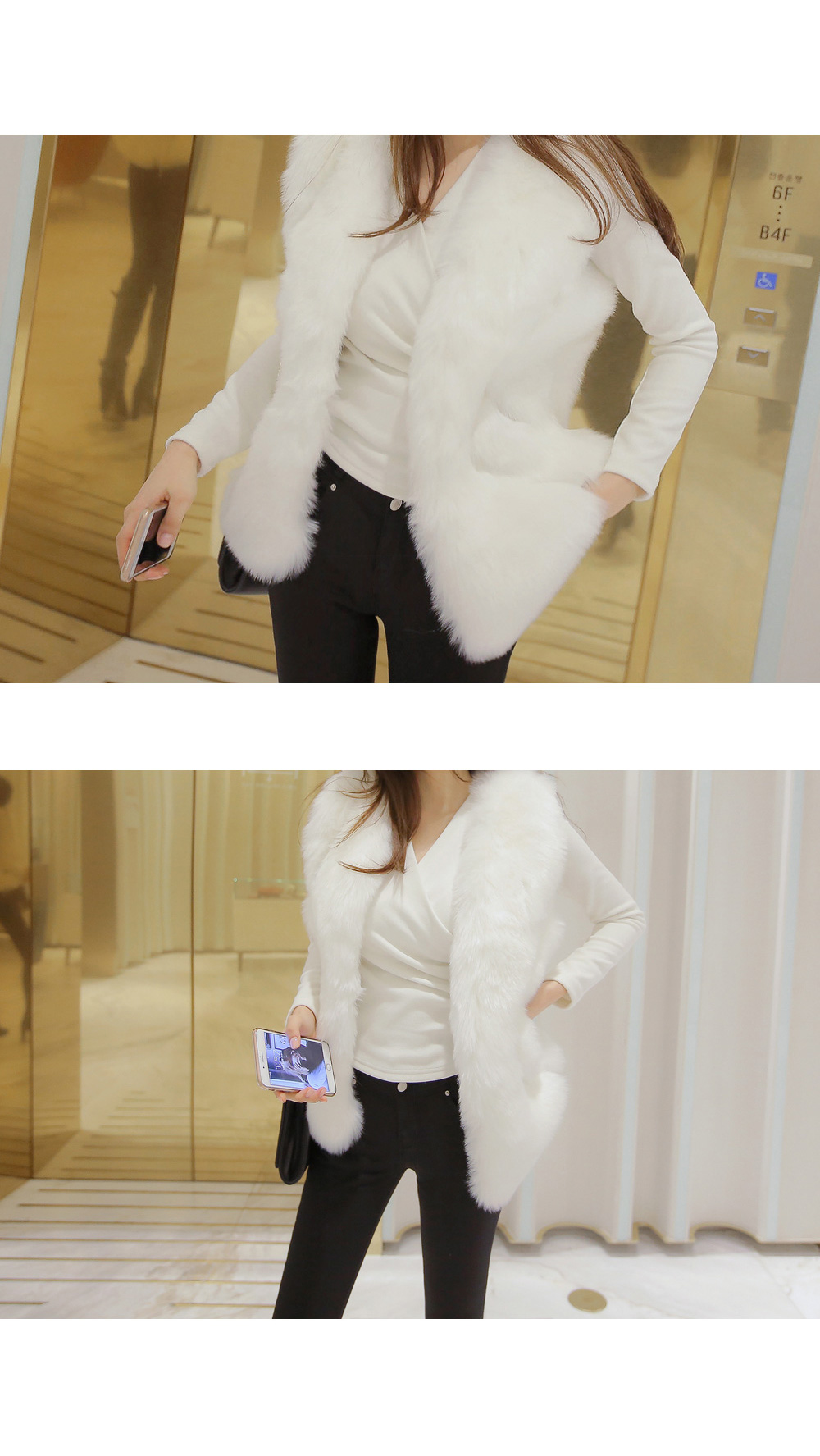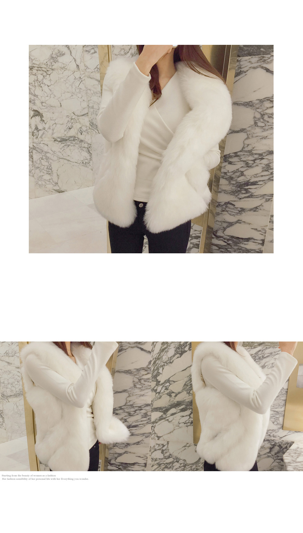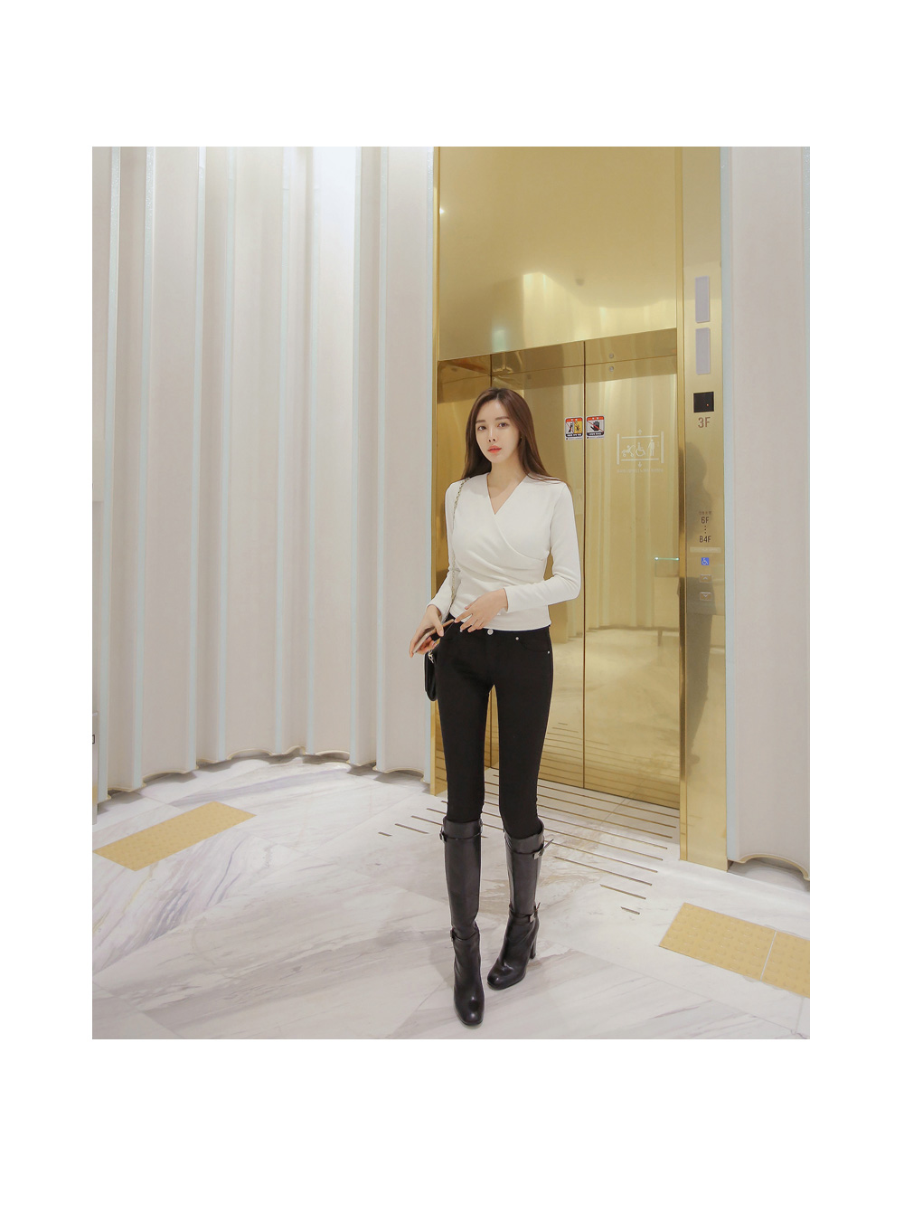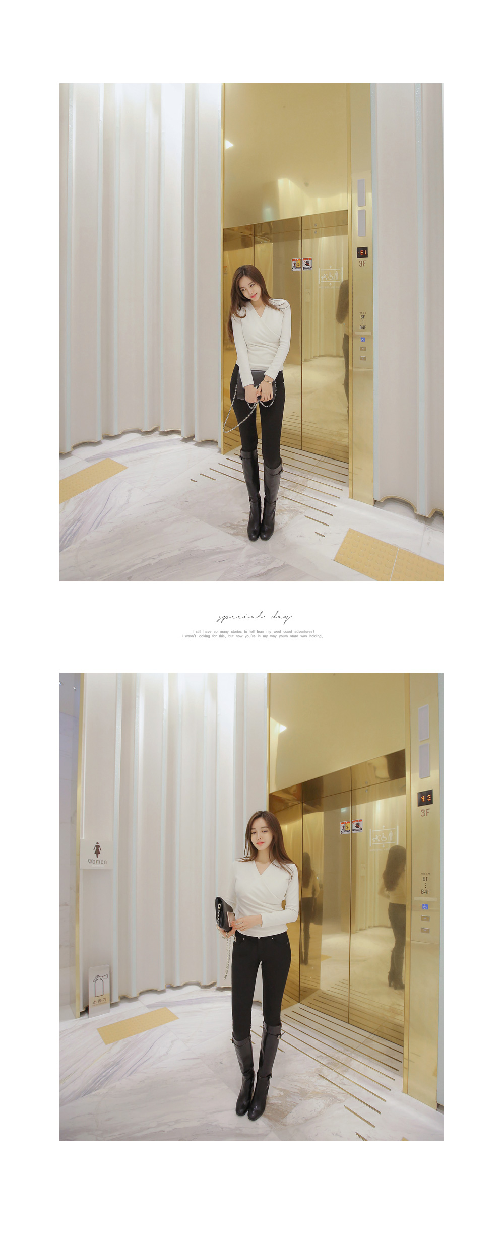 브이넥 으로 떨어지는 네크라인이 얼굴형을 갸름해 보이게 해 주는건 물론이며, 바디에 타잇-하게 핏되어져 몸매가 한층 더 슬림해 보이고 길어보이는 효과를 주는데요