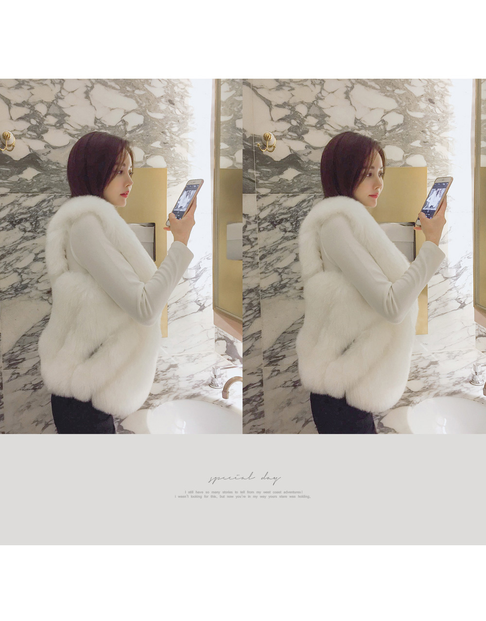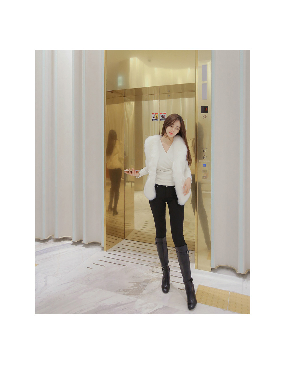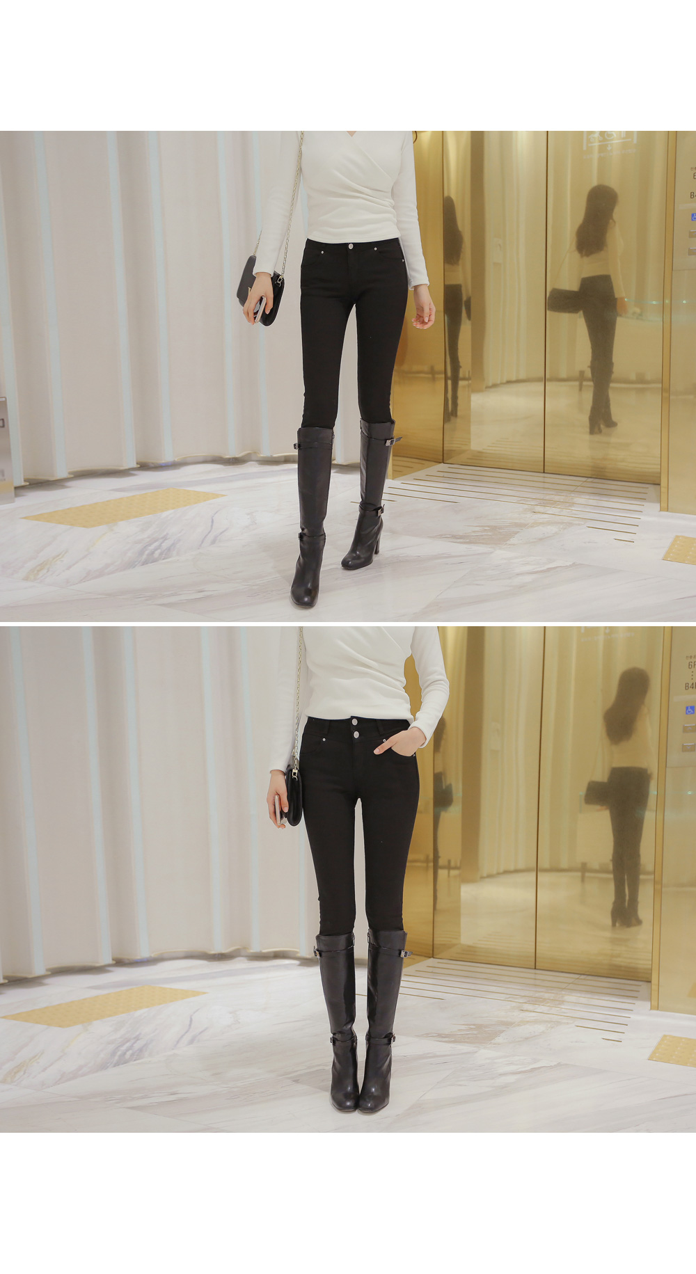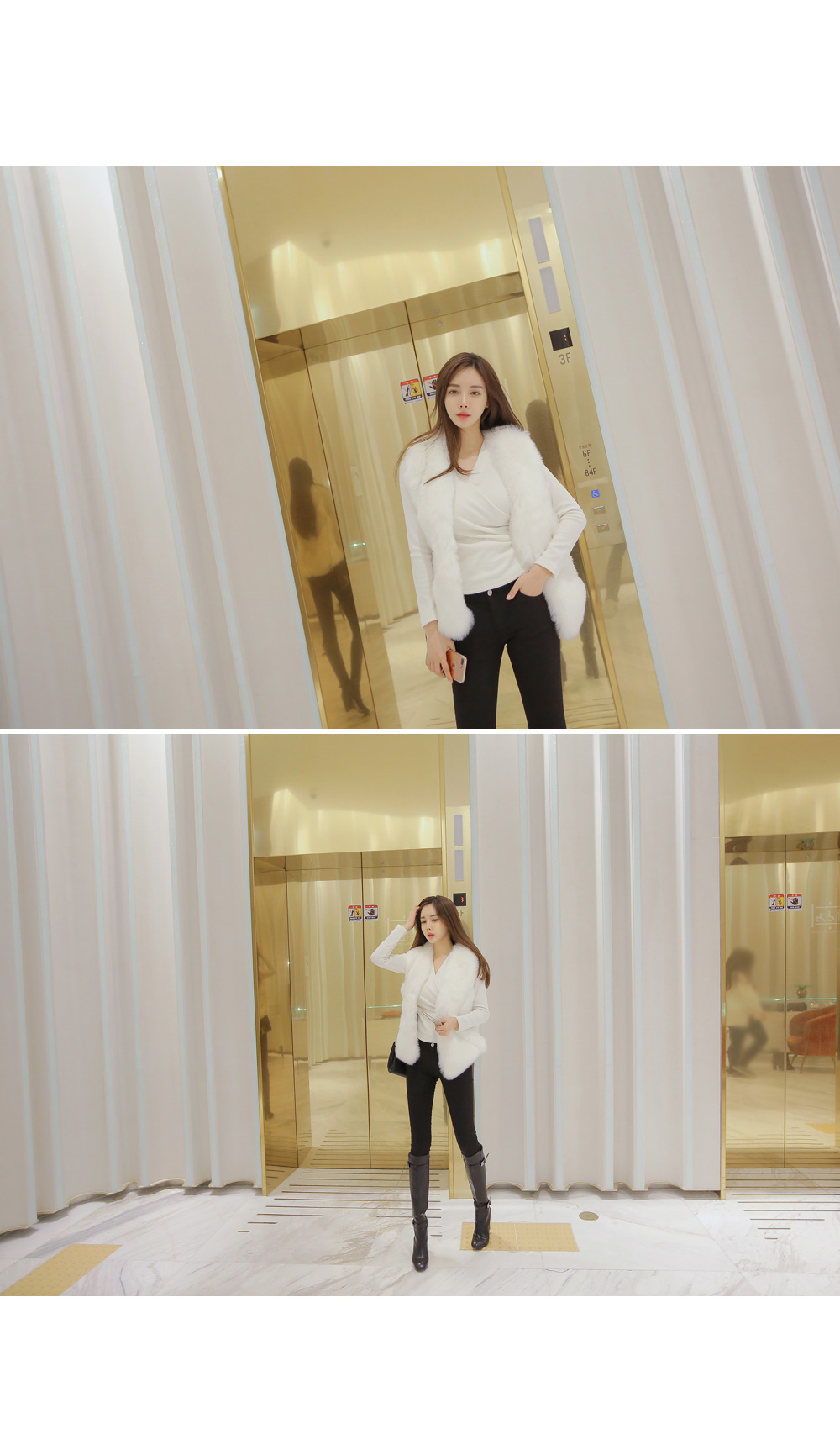 브이넥 으로 떨어지는 네크라인이 얼굴형을 갸름해 보이게 해 주는건 물론이며, 바디에 타잇-하게 핏되어져 몸매가 한층 더 슬림해 보이고 길어보이는 효과를 주는데요