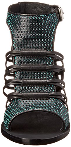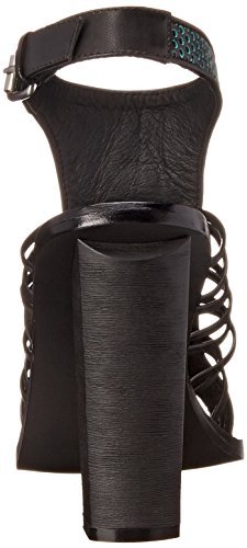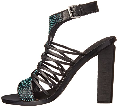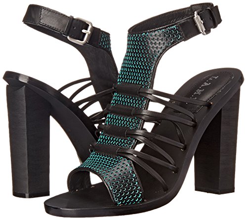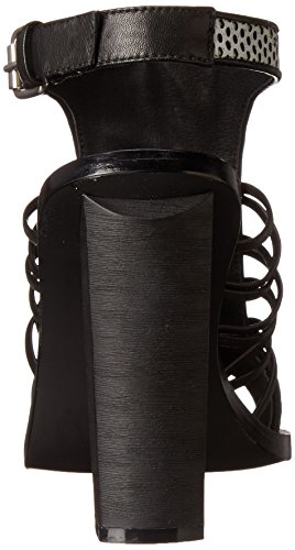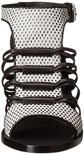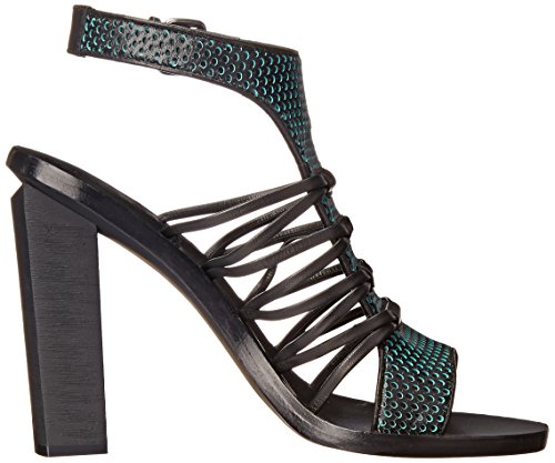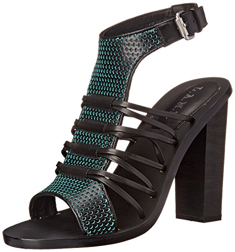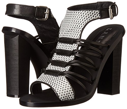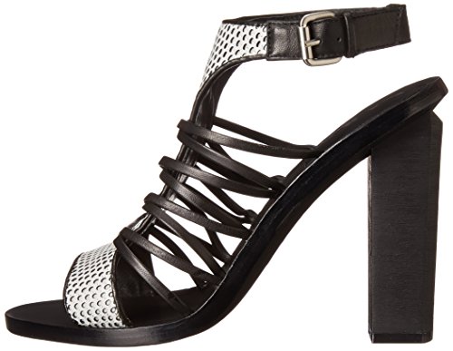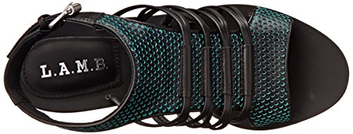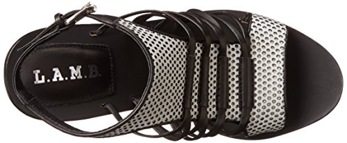 Product DescriptionSkinny straps cross over perforated leather on these bold L.A.M.B. sandals. The inset, painted wood heel adds an elegant accent. Buckle closure. Synthetic sole.0