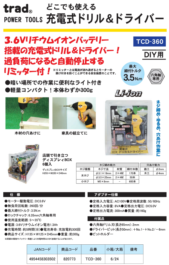 3.6Vリチウムイオンバッテリー搭載。過負荷になると自動停止するリミッター付。暗い場所での作業に便利なライト付。ネジ締め・緩め・穴あけ作業に便利。