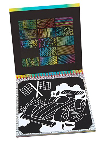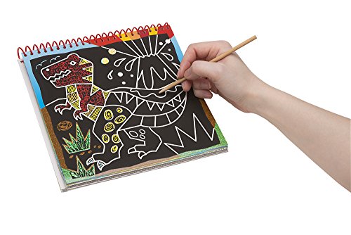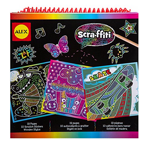 ALEX Toys Artist Studio Scra-ffiti - So Cool lets artists create beautiful colored designs. With the special black paper the Scra-ffiti book is made so that when you draw with the wooden stylus, the top layer of the paper scratches away revealing a rainbow of colors underneath! Use the pattern guide to match different scratching techniques for cool effects. The book contains 19 pages of buildings, robot, rocket, pirate ship and dinosaur designs, a sheet of scratchable stickers and a wooden stylus. Recommended for children 5 years of age and older.Feature