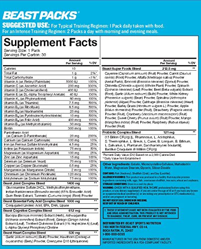 -. Title : Beast Packs All-In-One Daily Multi-Vitamin Packs: A Multi-Vitamin Complex plus Probiotics, Joint Complex, Brain Function, Heart Health, with Fish Oil and CLA. Performance and Wellness. 30 Servings