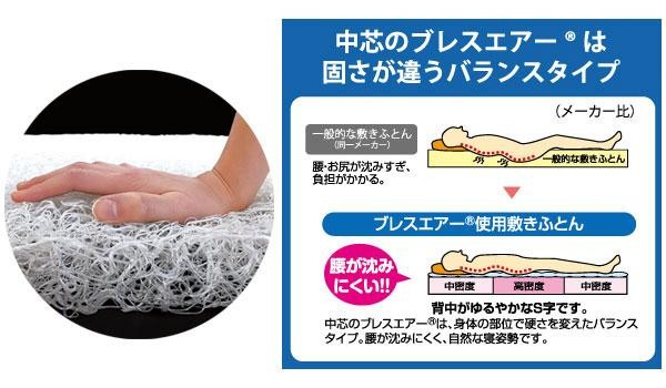 へたりにくく、高反発で寝返りがうちやすいクッション材「ブレスエアー(R)」を使用し、高反発と体圧分散性を最大限に活かす中空タイプ。中心のブレスエアー(R)は硬さが違うバランスタイプなので背中がゆるやかなS字曲線に!!通気性が高くムレにくいのも特徴です。 |