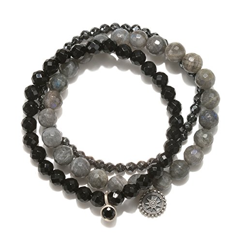 Round faceted 8mm Labradorite, 6mm Onyx, and 4mm Hematite stones are paired with a Sterling silver 10mm Mandala charm and Onyx stone.