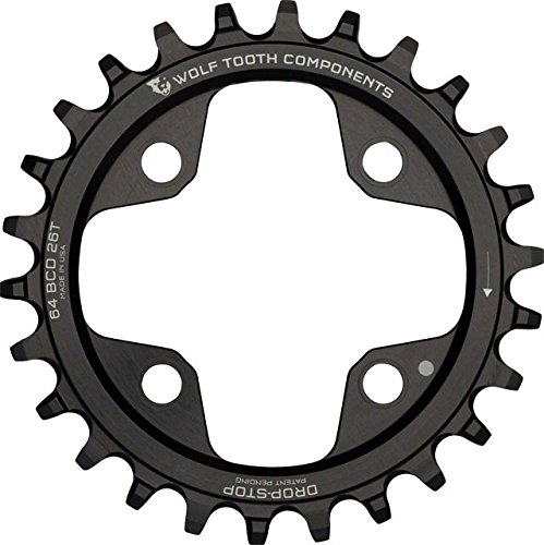 Studio : Wolf Tooth Components Publisher : Wolf Tooth Components Product Description These ingenious rings allow you to run a 1x setup on a 104/64 crank with a tooth count lower than 30T. Made from 7075 Aluminum for long lifeNot compatible with 9 speed chainsChainline ranges from 46mm to 48mm depending on the cranks usedFeatures Wolf Tooth's Drop-Stop tooth design for maximum chain retentionFor use with an 11 or 10 speed chain Item SpecificationsColorBlackMaterialAluminumTeeth26Chainring BCD64Defined ColorBlackRing Position/TYPEChain Retaining Single Ring 0