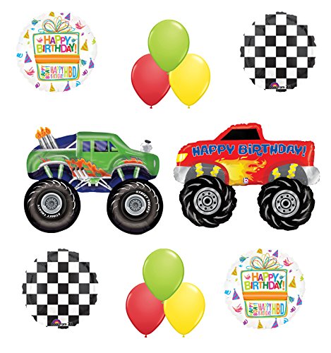 -. Feature : (1) 45" Green Monster Truck Foil Balloon / (1) 40" Red Happy Birthday Monster Foil Balloon / (2) 18" Checkered Flag P.R.Int Foil Balloons / (2) 18" Birthday Present Foil Balloons / (6) 11" Latex Balloons 2- Lime Green, 2- Yellow and 2- Red