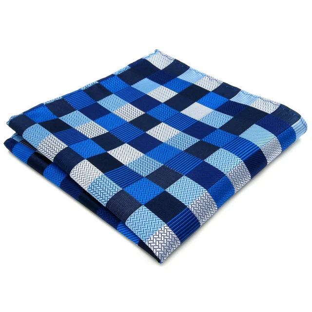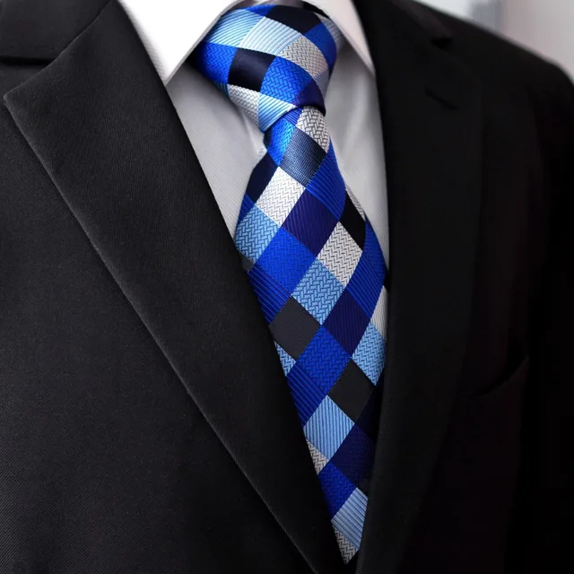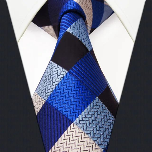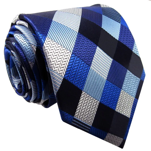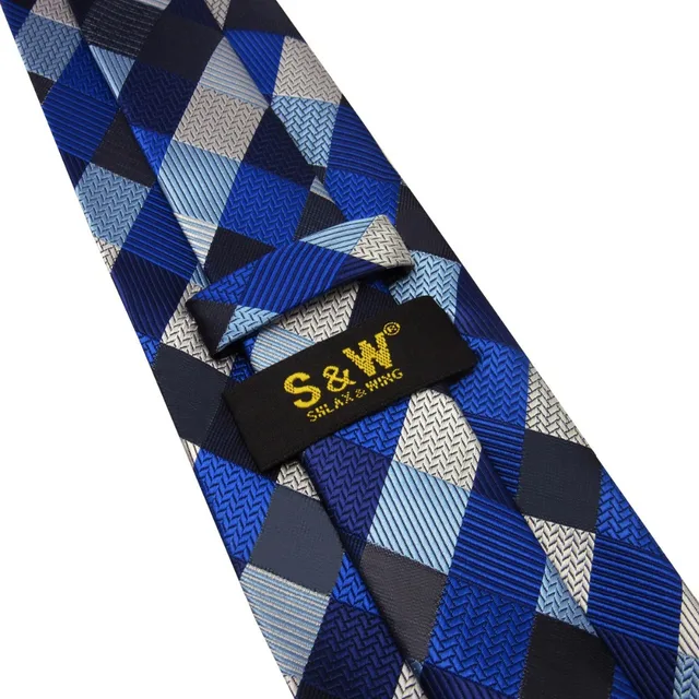 | [해외]S2 여분의 긴 사이즈 체크 블루 실버 블랙 남성 넥타이 일치하는 손수건 100% 실크 자카드 짠 패션 |