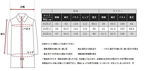 -. Feature : SIZE:2 本体(肩幅:43cm 袖丈:63cm バスト:110cm ヒップ:112cm 着丈:80.5cm)ライナー(肩幅:40cm 袖丈:60.5cm バスト:100cm 着丈:66cm) / SIZE:3 本体(肩幅:44cm 袖丈:64.5cm バスト:114cm ヒップ:115cm 着丈:84cm)ライナー(肩幅:41cm 袖丈:61.5cm バスト:103cm 着丈:68.5cm) / SIZE:4 本体(肩幅:47cm 袖丈:64.5cm バスト:118cm ヒップ:121cm 着丈:85cm)ライナー(肩幅:41.5cm 袖丈:62.5cm バスト:106cm 着丈:70cm)