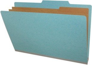 -. Feature : This classification file folder has two dividers and six filing sections. / It has a 2/5 Cut right-of-center top tab for drawer filing. / It is legal size to hold 8-1/2" x 14" documents. / This folder is made of 25 pt light blue pressboard stock and has two 17 pt kraft dividers with duo fasteners. / BUY 5, SAVE 10%
