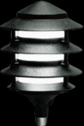 This RAB Lighting LL22B incandescent four-tier lawn light uses an incandescent 100W A19-type bulb (not included) that produces 1,650 lumens of illumination. It accepts 120V input power, has a black cast aluminum housing that is lightweight and corrosion-resistant and a threaded, gasketed clear glass globe for durable weatherproofing and easy relamping. This incandescent lawn lamp is Underwriters Laboratories (UL) Listed for use in wet locations, has available an optional threaded mounting stem system to support the lamp housing, and is suitable for use in outdoor lighting, such as along pathways.