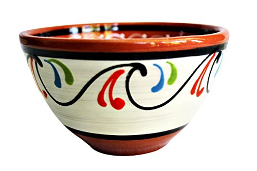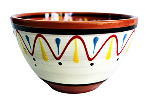This beautiful set of terracotta bowls is ideal for serving fruit, cereal, salad or soups. The white and terracotta set of the colors - beautiful, fun and vibrant! The shape stores and stacks easily and the hand painted terracotta is durable. Please note, that since each bowl is hand crafted and hand painted, there will be small imperfections that make each piece unique and special. Each set is composed of 5 different designs. Cactus Canyon Ceramics also offers a smaller condiment bowl, and a smaller salsa bowl, which can be seen in several of the photos. We also sell sets of colored terracotta bowls and dishes.Feature