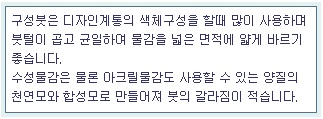 구성붓은 디자인계통의 색체구성을 할때 많이 사용하며 붓털이 곱고 균일하여 물감을 넓은 면적에 얇게 바르기 좋습니다.