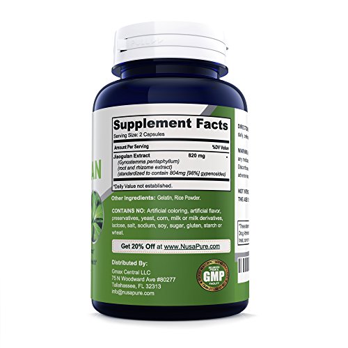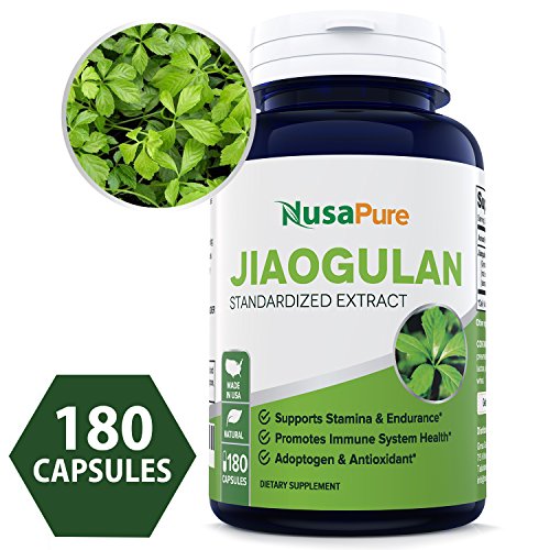 -. Feature : ✅ ✅ ✅ STRENGTH JIAOGULAN EXTRACT: NusaPure's maximum strength Jiaogulan extract contains 820mg of pure Jiaogulan extract per serving. With 180 capsules in every bottle, you receive a full 90 day supply. Jiaogulan, also known as Gynostemma pentaphyllum, is a climbing vine indigenous to Japan, Vietnam, Southern Korea, and China. Jiaogulan is thought to have powerful antioxidant & adaptogenic properties. * / ✅ ✅ ✅FEEL THE DIFFERENCE: Jiaogulan is best known as a adaptogen and antioxidant in herbal medicine. The crushed whole Jiaogulan Leaf is often consumed as herbal tea. Jiaogulan supplements support stamina & endurance, promotes immune system & cardiovascular health, & supports healthy cholesterol levels. Our Jiaogulan extract formula contains high potency Gypenosides, which are closely related to the ginsenosides that are naturally occurring in Panax Ginseng. Powerful When Paired With L-Theanine* / ✅ ✅ ✅ NATURAL & MADE IN THE USA: NusaPure's Jiaogulan supplement contains 820mg of Jiaogulan root and rhizome extract per serving (2 capsules). Our natural herbal formula is made from pure Jiaogulan, is Caffeine free, and contains high potency Gypenosides. It does NOT contain preservatives, soy, gluten, dairy or extraneous fillers. Our potent complex is made in the USA, in an FDA registered and GMP compliant facility. Our products go through rigorous testing to ensure quality & purity. * / ✅ ✅ ✅ BEST VALUE ON AMAZON: Our maximum strength Non-Irradiated Jiaogulan 820 MG formula is backed by our 100% Money Back Guarantee for 30 days. Jiaogulan is an AMPK Activator (activating AMP-activated protein kinase). AMPK has a wide range of benefits: helps decrease inflammation, supports blood flow & oxygen delivery, supports anti-aging, increases metabolism & helps produce new mitochondria. * / ✅ ✅ ✅ COMMON NAMES & FORMS: Jiaogulan (Gynostemma pentaphyllum) is often referred to as Southern Ginseng. It is sometimes spelled Jiao Gu Lan, and comes in many forms including powder, capsule, veggie cap, tablet, pills, soft gel, herbal tea, or even whole leaf herb. Jiaogulan is widely regarded as an AMPK activator with antioxidant & adaptogenic properties. *