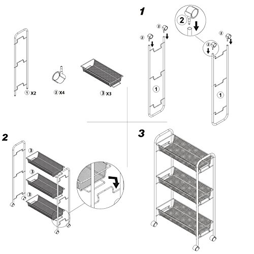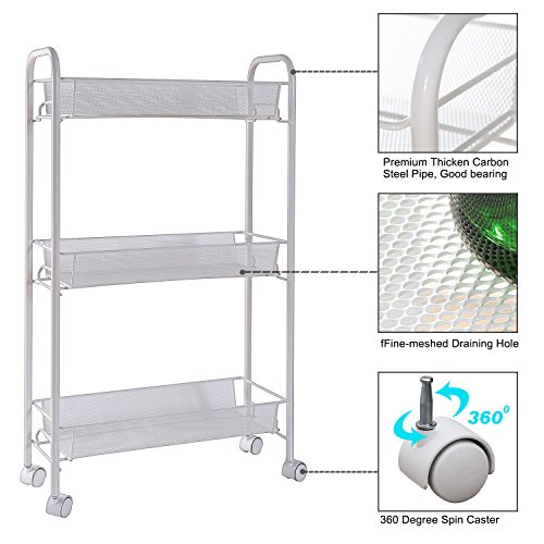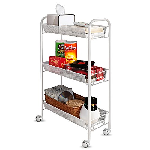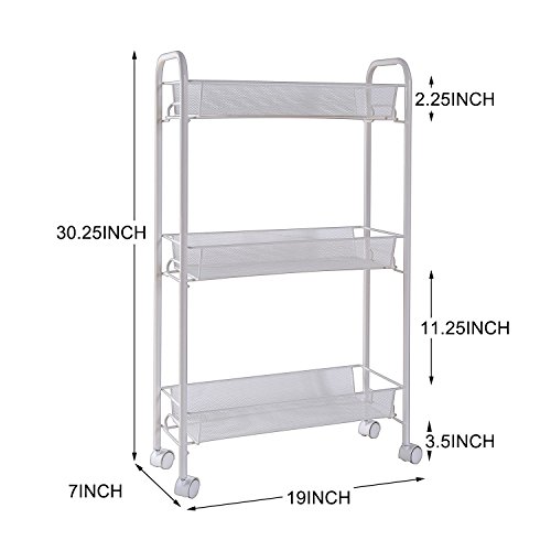 Not Enough Space To Store Your Household Wares? What You Need Is Just A CreaTwo Rolling Cart ! Convenience Storage Oganization for kitchen, bathroom and Office 4 Pieces well matched casters makes this 3 tier rolling cart easy to stand moving smoothly. The mesh baskets create ample storage spaces to store many kinds of kitchenwares, toiletries and office supplies. This portable serving cart makes it possible to have more spaces for your daily life. It's a good partner when you cooking as well as storing utensils and tools, allows you to use this piece of furniture for a variety of purposes in your living room, holds beauty supplies in dressing room, keep all the little things in order and within reach when you need it. Sturdy, Stylish and Long Life Using. Made with preimum carbon steel, sturdy and durable for long time using and no harm to environment, the simple and well construction make sure this utility cart stand stable. With white epoxy oil coating finish, this upscale appearance design will be a good choice for modern life. It's stability and sturdiness always keep your utensils and tools safe, provides a very good solution for saving sapce and organizing in your daily life. Easy to installing and 12 Months Warranty. This serving cart can be put together in 5 minutes without any tools. We provide a lifetime guarantee for this cart, and we checked each package carefully before delivery to make sure all accessories were perfect included, with a concise user manual, you can understand and assembly very easily. Approximate Dimensions: Overall - 30.25H*19L*7W (in inches) Package Includes: 1 x Creatwo Rolling Cart 1 x User Manual 0