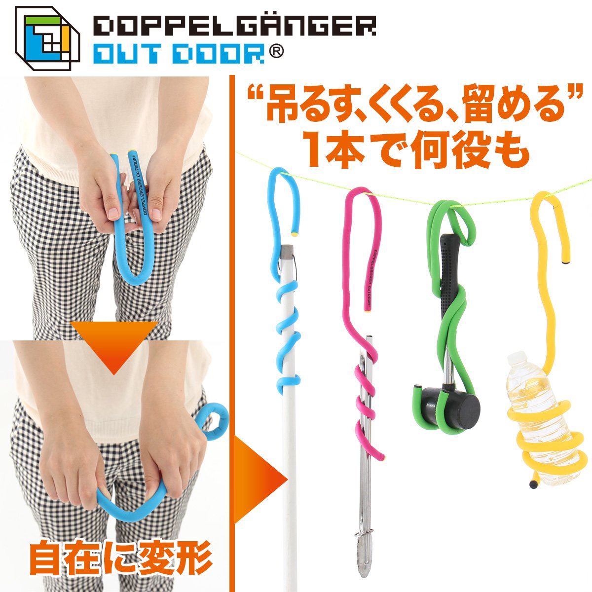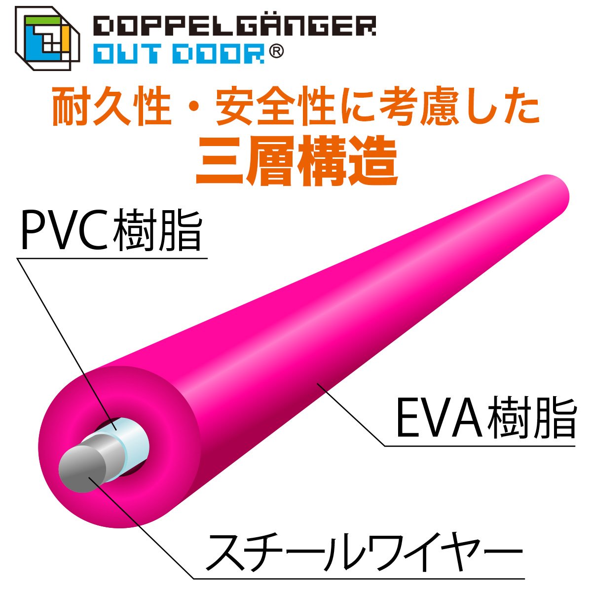 By covering a tough steel wire with two layers of resin, flexibility that can be easily bent and a load capacity of 130 kg are realized.