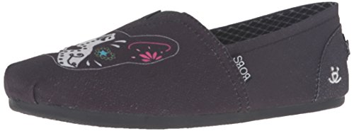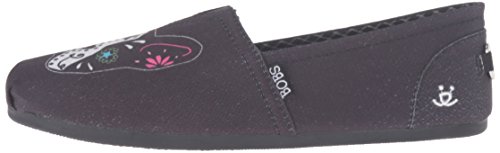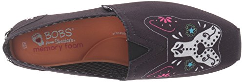 Binding : Apparel Product Description Boston Terrier love mixes with Dia de los Muertes design in the Skechers Bobs for Dogs Bobs Plush - New Day shoe from our charitable shoe program. Soft woven textile upper with sugar-skull inspired boston terrier print design in a slip on casual comfort alpargata flat with Memory Foam insole. Special edition partnership with Best Friends Animal Society®. Smooth woven textile fabric upper; Front panel features Boston terrier print design Slip on casual alpargata flat design; Colorful Dia de los Mueres sugar-skull inspired artwork Stitching accents; Tucked toe pleat front; Diagonal stitched seam front detail; Heel fabric overlay panel Top elastic fabric panel for easy slip on fit; Metal 'Bobs for Dogs' bone shaped logo detail on heel Soft fabric shoe lining; Memory Foam cushioned comfort insole Flexible rubber traction outsole Skechers is proud to team up with Best Friends Animal Society; For every Bobs shoe purchased, Skechers will donate to Best Friends. 0