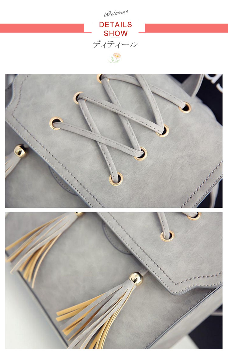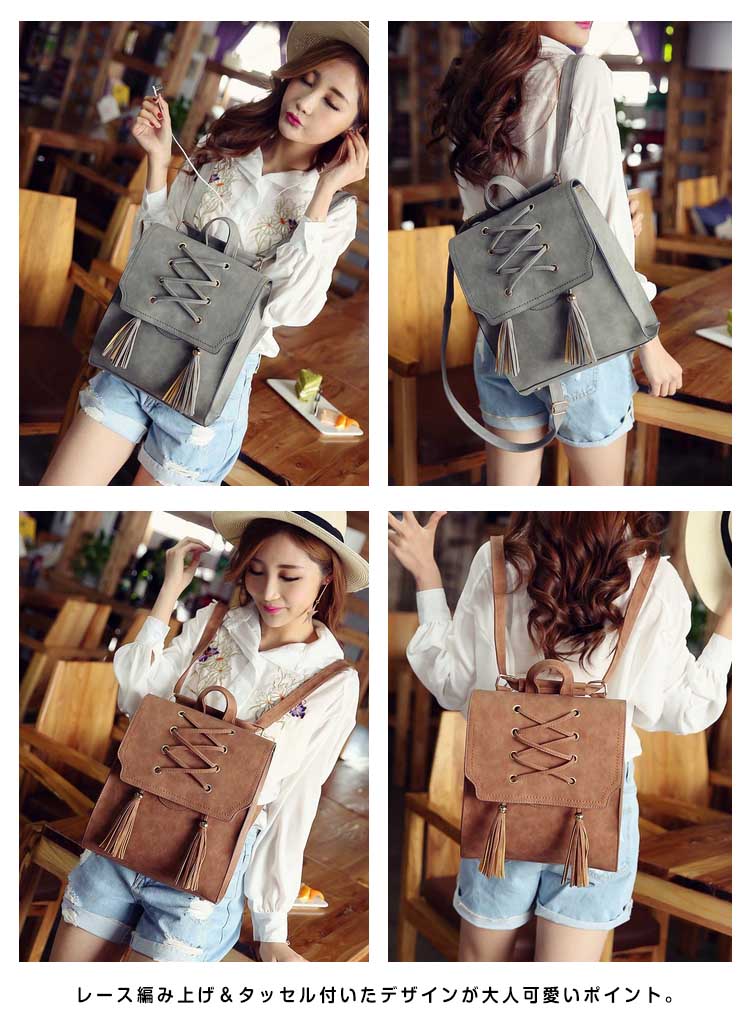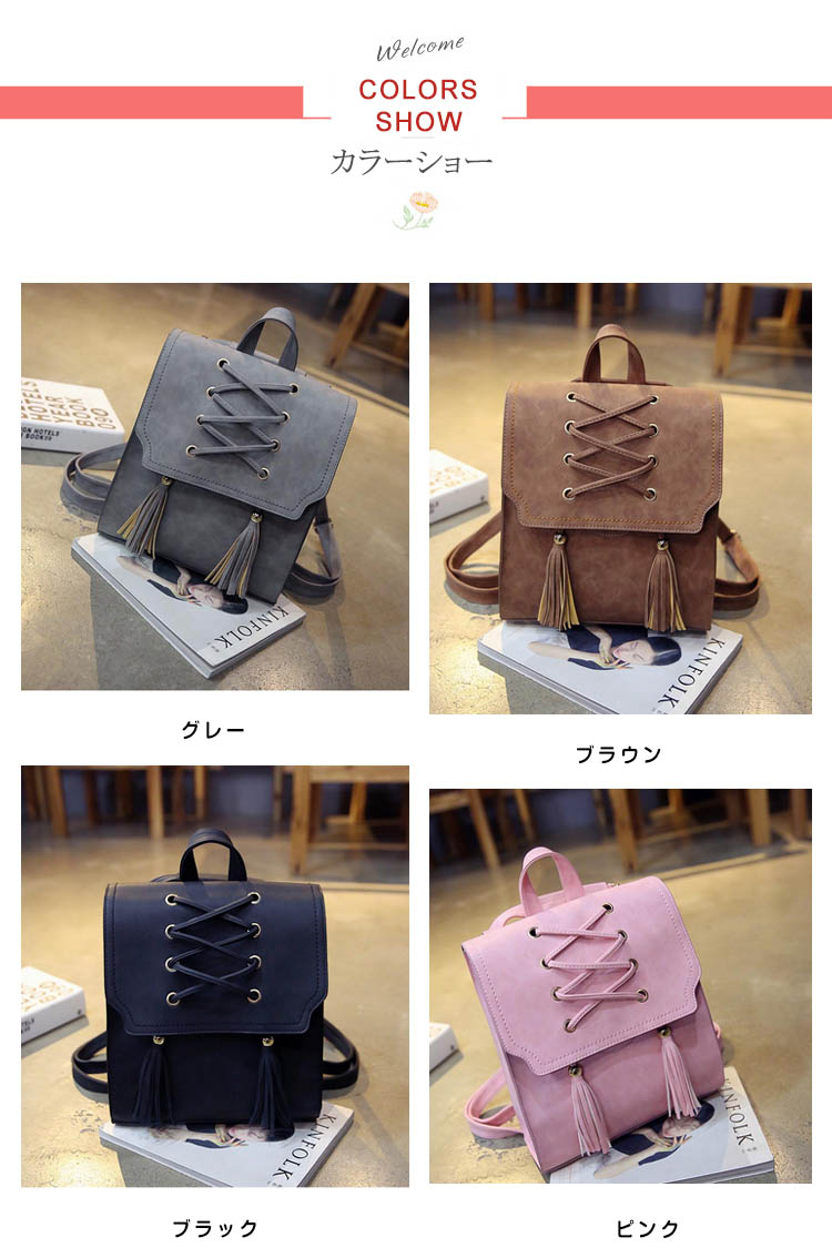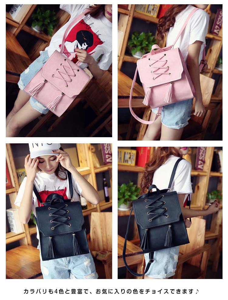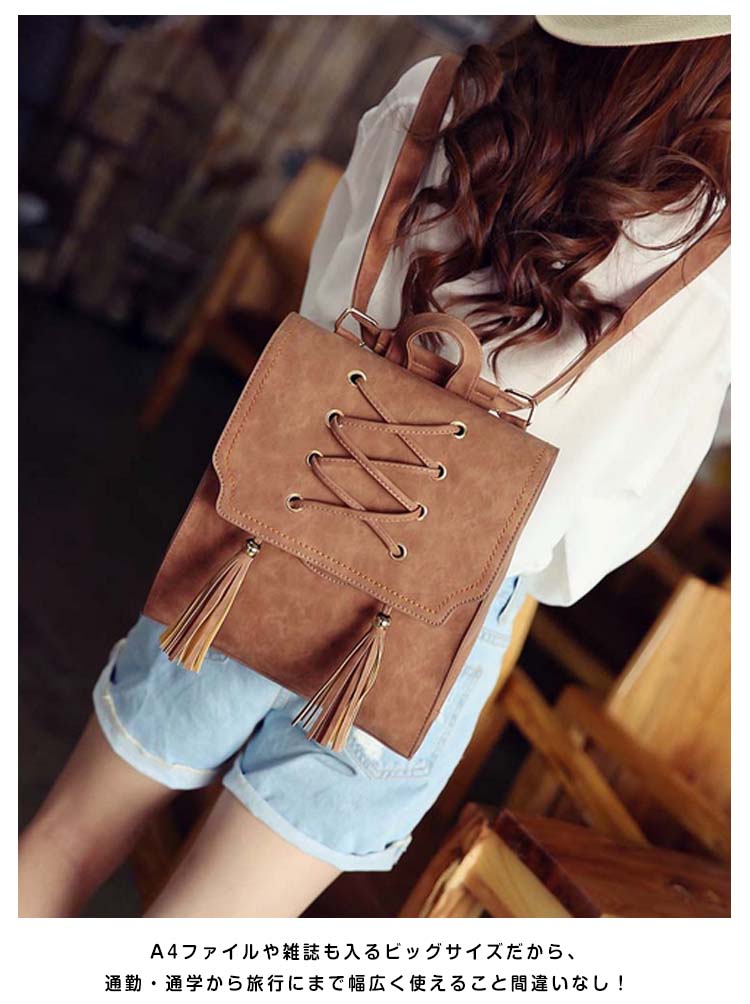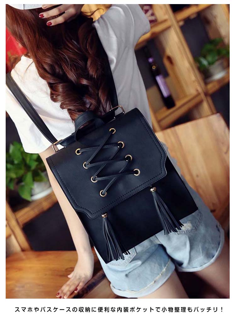 | おしゃれなカジュアルになりすぎない大人のリュックサック!!レース編み上げ&タッセル付いたデザインが大人可愛いポイント。A4ファイルや雑誌も入るビッグサイズだから、通勤・通学から旅行にまで幅広く使えること間違いなし!カラバリも4色と豊富で、お気に入りの色をチョイスできます♪スマホやパスケースの収納に便利な内装ポケットで小物整理もバッチリ!シンプルなデザインがどんなコーデにもあわせやすく、大活躍間違いなしのアイテム! | |