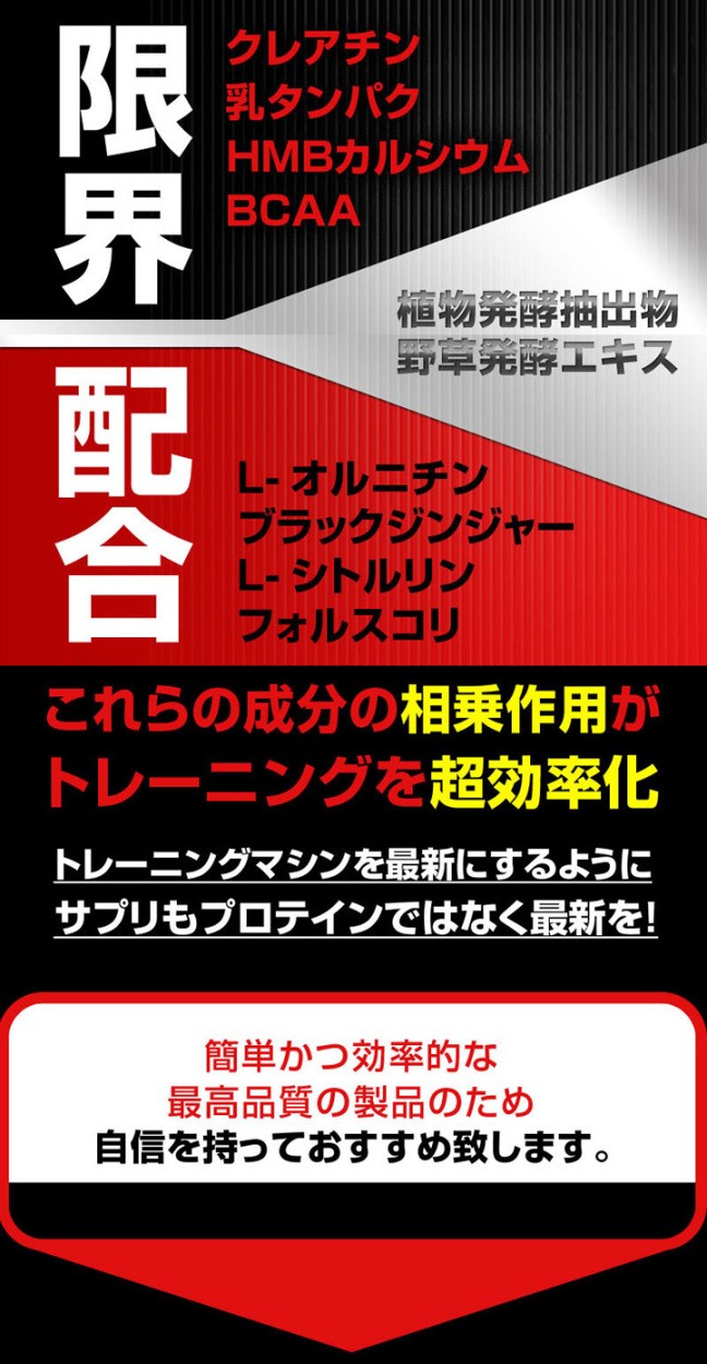 | 原材料名 | クレアチン、ブラックジンジャー抽出物、L-シトルリン、L-オルニチン塩酸塩、デキストリン、植物醗酵抽出物(デキストリン、果実・野菜(オレンジ、パイナップル、バナナ、リンゴ、パパイヤ、グァバ、人参、キウイフルーツ、他)、穀物(玄米、インゲンまめ他)、野草エキス(パフィアローズマリー他)、糖類、海藻類、野草醗酵エキス末、(デキストリン、野草醗酵エキス)、植物醗酵エキス末(コーンスターチ、デキストリン、植物醗酵エキス)、植物醗酵食品(デキストリン、黒砂糖、甜葉糖、麦芽糖、ウコン、ヨモギ他)、穀物麹(大麦、あわ、ひえ、きび、タカキビ、紫黒米、米)、水素吸蔵サンゴ末、鶏肉抽出物、乳タンパク、コレウスフォルスコリ抽出物、HMBCa酵母(亜鉛、マンガン、銅、ヨウ素、セレン、クロム、モリブデン含有)、ブドウ糖/結晶セルロースゼラチン、ショ糖脂肪酸エステル、微粒酸化ケイ素、L-バリン、L-イソロイシン、シクロデキストリン、植物レシチン(一部に乳成分・ゼラチン・鶏肉・オレンジ・キウイフルーツ・大豆・やまいも・りんご・バナナ・ゴマ・カシューナッツを含む) |
