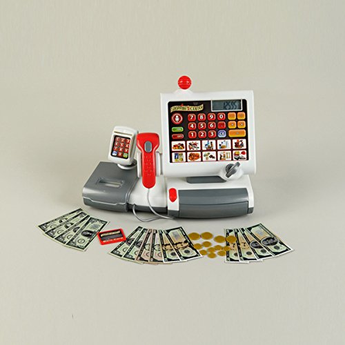 -. Binding : Toy -. Brand : Theo Klein -. Color : White -. EAN : 0759455293214 -. Feature : Includes: New electronic cash register with various functions Microphone for P.R.Ice checks Key for opening and closing cash drawer / Scanner for UPC/EAN codes and credit card Touch screen with display and computer functions US coins and paper money / Materials: Plastic , 3 AA batteries required / Colors: White / Dimensions:12 x 6 x 9 -. IsAdultProduct : 0 -. Label : Theo Klein -. Manufacturer : Theo Klein -. ProductGroup : Toy -. ProductTypeName : TOYS_AND_GAMES -. Publisher : Theo Klein -. Studio : Theo Klein -. Title : Electronic Cash Register Need For Your Little Ones To Run Their Own Store -. UPC : 759455293214