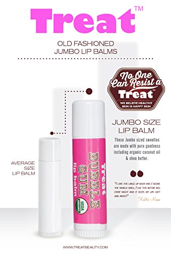 -. Binding : Health and Beauty -. Brand : Treat -. EAN : 0851656003774 -. Feature : SAVE $2 OFF the yummiest lip balm in the world for a limited time! Enter code Bubble02 at checkout / Do you need a lip balm to soothe your dry chapped lips? Healthy lips are happy lips and this lip balm moisturizes with only pure organic ingredients / JUMBO sized and JUMBO nourishment: this lip balm is more than triple the size of a normal lip balm; it's super sized and super fun; you will love it / USDA certified organic: go ahead, taste it; treat lip balms are good enough to eat, well don't eat it but a little taste won't hurt / Made with pure organic coconut oil: is the ultimate natural moisturizer and so good for chapped lips -. Label : Treat Beauty -. Manufacturer : Treat Beauty -. Model : Bubble Gum Lip Balm -. MPN : Lip166845 -. NumberOfItems : 1 -. PackageQuantity : 1 -. PartNumber : Lip166845 -. ProductGroup : Beauty -. ProductTypeName : BEAUTY -. PublicationDate : 2015-09-17 -. Publisher : Treat Beauty -. ReleaseDate : 2015-06-01 -. Size : 0.5 Ounce -. Studio : Treat Beauty -. Title : Treat Jumbo Flavored Lip Balm with Organic Coconut Oil to Soothe Chapped Lips, Bubble Gum, 0.5 Ounce -. UPC : 851656003774
