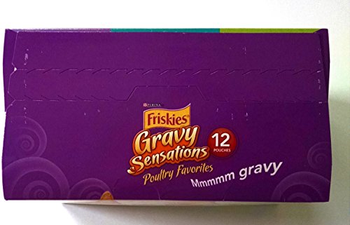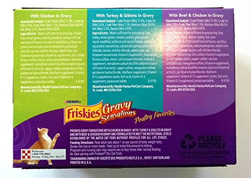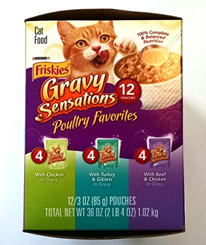 - Feature : Twelve (12) 3 Ounce Pouch of Purina Friskies Gravy Sensations Poultry Favorites Cat Food Variety Pack / 100% Complete & Balanced for the Growth of Kittens and Maintenance of Adult Cats