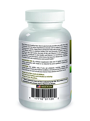 Best Naturals Healthy Hair, Skin & nails formula provides you with the vital nutrients and the latest ingredients in beauty care to support your natural beauty from within, B vitamins help with energy metabolism and Biotin helps to maintain healthy hair and promotes healthy nails by acting at the nail matrix, base of nail.Feature