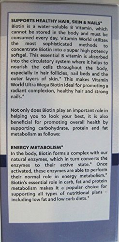 Supports Healthy Hair, Skin & Nails** Biotin supports the metabolism of carbohydrates, fats and proteins for energy use.** Ultra Mega Biotin is designed to provide ample amounts of this essential nutrient to maximize its benefits.* So no matter what type of healthy eating plan you follow, Ultra Mega Biotin is an excellent choice for nutritional support.**Feature