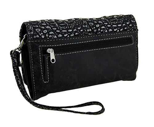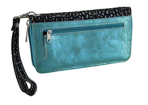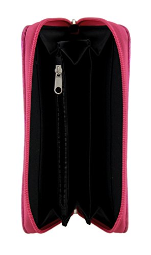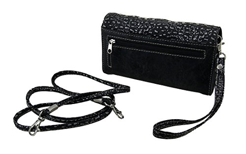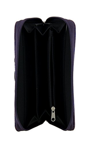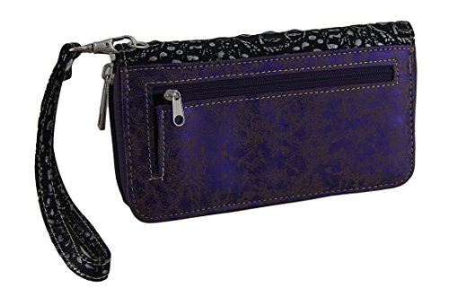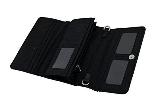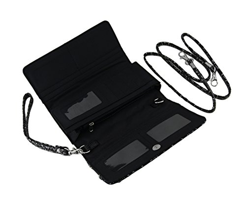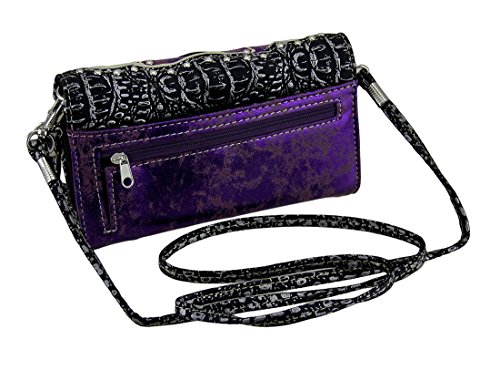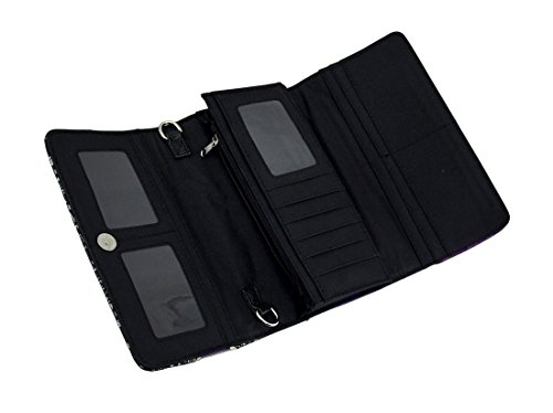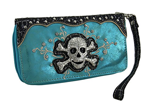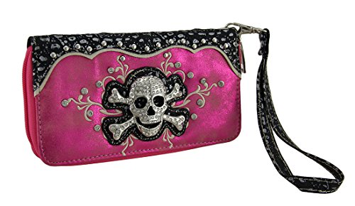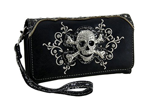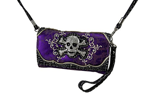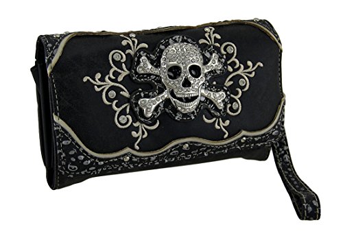 Studio : Zeckos Publisher : Zeckos Product Description Show off your fashionably rebellious side with this foil fabric wallet featuring a rhinestone covered skull, decorative embroidery, chrome and rhinestone studs, textured vinyl trim, a removable 1/2 inch wide wrist strap and a 1/4 inch wide shoulder strap that offers a 23 inch drop. This 7.5 inch long, 4.5 inch high, 1 inch wide (19 X 11 X 3 cm) skull wallet includes 12 card slots, 5 slip pockets, 1 zippered change pouch inside the polyester lined interior, 1 slip and 1 zip pocket on the back, and it secures with a magnetic snap. 0