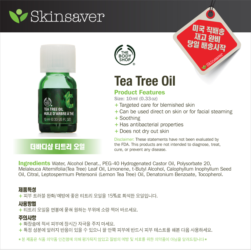 제조국 : 영국, 주요성분: 물, 알코올 Denat., PEG-40 수소 첨가 피마자 오일, 폴리 소르 베이트 20, 멜라루카 우카 (티 트리) 잎 오일, 리모넨, t- 부틸 알코올, Calophyllum Inophyllum 씨 오일, 시트 랄, 마누카 Petersonii (레몬 티 트리) 오일, Denatonium 안식향산 , 토코페롤
