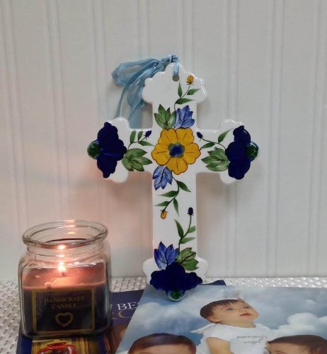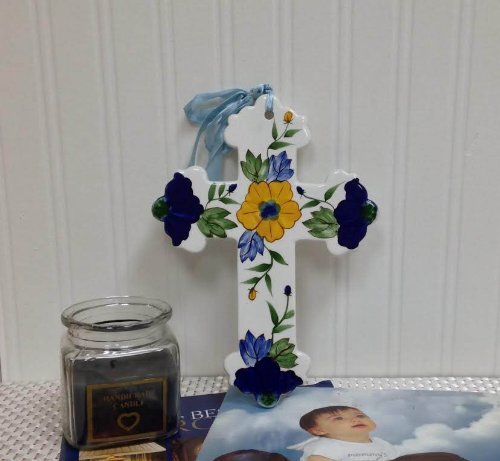 Precious Home Collection, Yellow Flower rounded by Blue Flowers Decoration Cross, 9-1/4"L x 6-3/4"W, 80952 By ACK