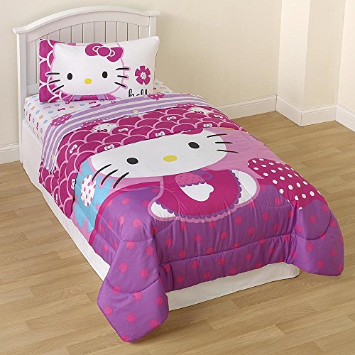 Bring colorful fun to your little one's bedroom with this Hello Kitty girl's comforter from Sanrio. With a reversible design, it lets your little one choose from small or large Hello Kitty images decorated with a mix of polka dots, scallops and floral print. Soft and comfortable, this microfiber comforter makes snuggling extra sweet. Woven construction Fabric: 100% polyester Care: Machine wash Imported