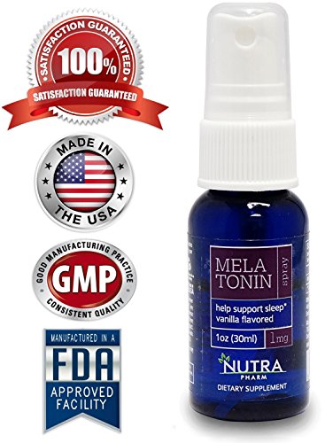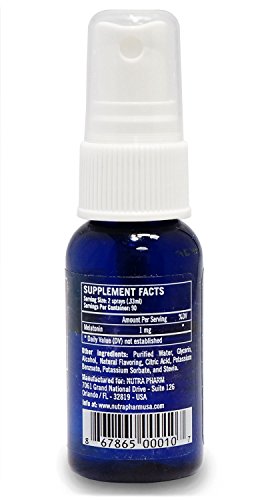 -. Binding : Health and Beauty -. Brand : Nutra Pharm -. Color : Dark Blue -. EAN : 0867865000107 -. Feature : Spray allows optimal absorption directly into bloodstream / Fast and Effective Sleep Aid / Great Tasting and no pills to swallow! / Spray allows you to use less with more benefits! -. IsAdultProduct : 0 -. Label : Nutra Pharm -. LegalDisclaimer : * Not intended for use by pregnant women or nursing women. If you are taking any medications, consult your doctor if any adverse reactions occur. Do not drive, operate machinery, or consume alcohol when taking this product. Limit use to 2 months with a break of one week. Not intended for persons under the age of 18. Keep out of reach of children. Store in a dry place and avoid excessive heat. *These statements have not been evaluated by the FDA. This product is not intended to diagnose, treat, cure or prevent any disease. -. Manufacturer : Nutra Pharm -. PackageQuantity : 1 -. ProductGroup : Health and Beauty -. ProductTypeName : HEALTH_PERSONAL_CARE -. Publisher : Nutra Pharm -. Size : 1.25"L x 1.25"W x3.8"H -. Studio : Nutra Pharm -. Title : Nutra Pharm Melatonin Spray 1 mg/1oz (30ml) Guarantees Deep Sleep, Supports Balanced Melatonin and Seratonin for Relief from Sleeplessness, Stress, Nervousness - Boosts Mood & Feelings of Well-being -. UPC : 867865000107