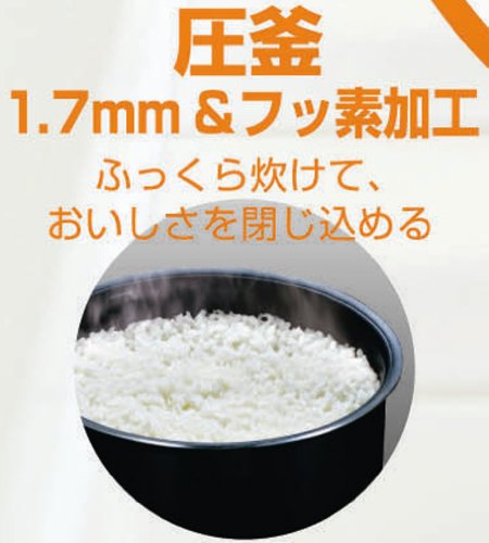 メニュー:白米・白米高速・雑穀・お粥 、 内釜:1.7mm(デュポン製・フッ素加工) 、 コントロールパネル:液晶表示 、 炊飯予約:1~15時間(カウントダウン予約タイマー・時計機能無し) 、 保温時間:12時間