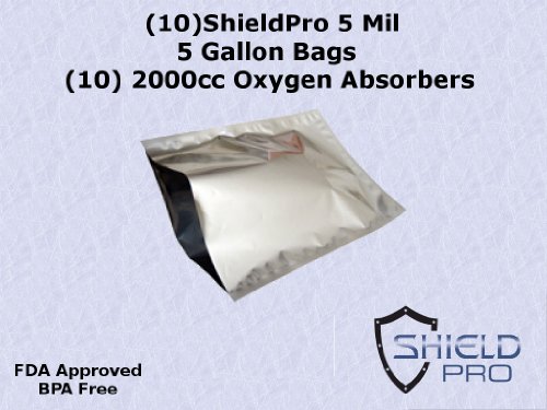 Contains: ? (10) Genuine 5-Gallon Mylar® Bags (18"x28") ? (10) 2000cc Oxygen Absorbers ? OxyEye insures freshness ? Tips and links to more information Genuine Mylar®