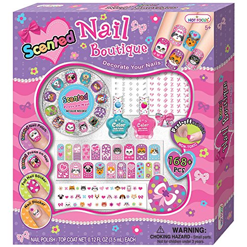 168-piece nail kit includes nail file, 20 press-on nail patches, and 12 press-on nail wraps (no glue needed), 3 sheets of decorative stickers, a ring, bottle of clear gloss top coat, and one bottle of peel-off polish!