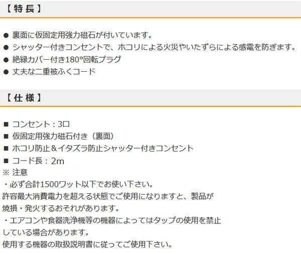 シャッター付きコンセントで、ホコリによる火災やいたずらによる感電を防ぎます。 生産国:中国 ※サプライヤー直送品 ご注文後3~4営業日後の出荷となります【商品名】OHM 磁石付タップ 3個口 2m HS-T1274W