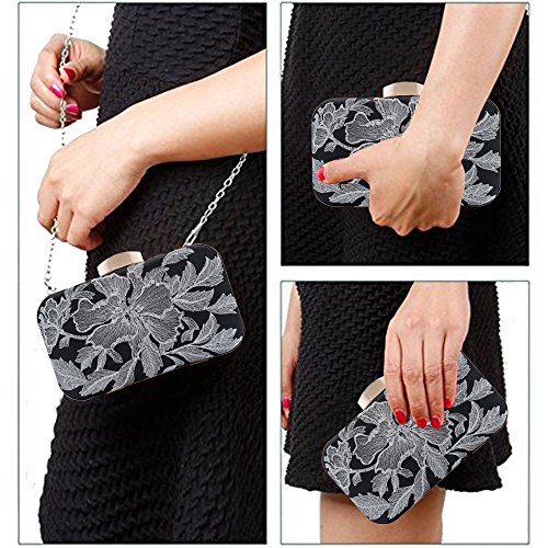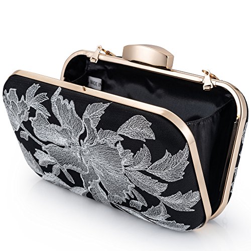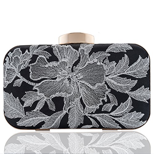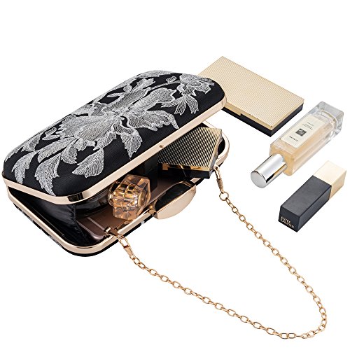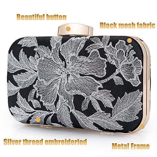 Womens Black Clutch Evening Bag Silver Thread Flowers Handbag Metal Frame Shoulder Bag Hard Case Purse