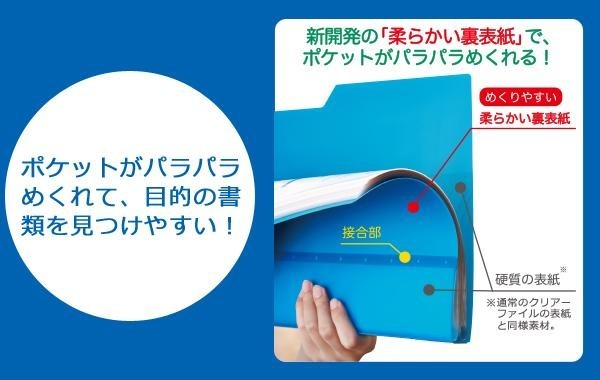 | 新開発の「柔らかい裏表紙」でポケットがパラパラめくりやすいクリアファイルです。さらに、表紙は切り欠き付きなので、ポケットをサッとつかめます。 |