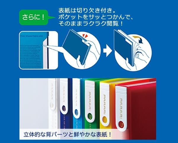 新開発の「柔らかい裏表紙」でポケットがパラパラめくりやすいクリアファイルです。さらに、表紙は切り欠き付きなので、ポケットをサッとつかめます。 |