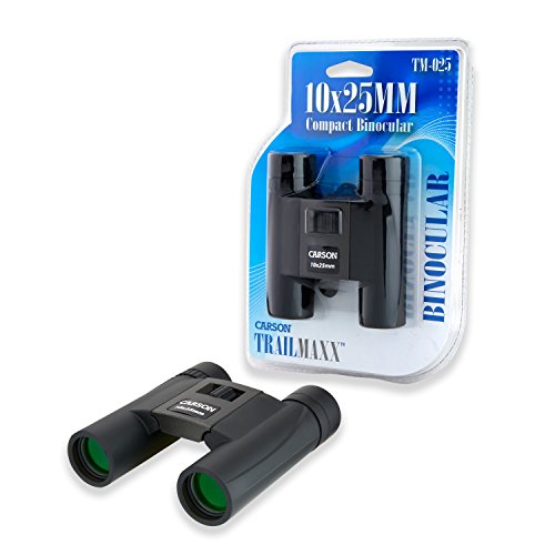 The Carson TrailMaxx 10x25mm binocular is extremely durable, compact and lightweight. Weighing only 0.61 pounds, it is the perfect binocular to take with you to concerts, sporting events, camping, hiking, traveling and so much more! The TrailMaxx 10x25mm binoculars has a center focusing knob with barrels that fold in which allows for easy storage. The multi-coated lenses will allow for crystal clear images. The TrailMaxx binoculars come included with a pouch, strap and lens cloth.SpecificationMagnification - 10xObjective Lens Diameter - 25 mm.Prism Type - BAK-7Lens Coating - Multi CoatedField of View (at 100m/at 100yds.) - 288'' at 1,000 yardsEye Relief - 10.5 mm.Weight - 0.61 lbs.Dimension - 4.125 x 1.375 x 4.625 in.