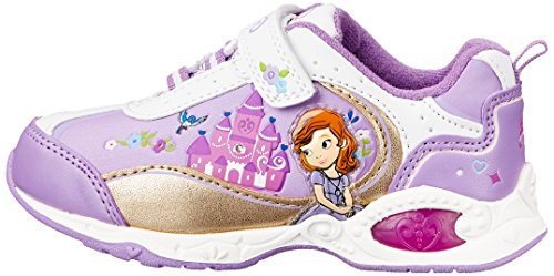 Item: Disney Sofia The First CH70753. - Upper: Faux Leather/Nylon. - Style:Kids' athletic sneaker featuring faux leather uppers with bungee lacing and hook and loop enclosure - padded collar and tongue - nylon sport lining - matte gold metallic trim - character artwork with stomp-activated red LED lighting accents - and rubber outsole. Constructed with NATURETEX 70 recycled material insole board. - Sole: Rubber. - Heel: 1/2 inch heel. - Lining: Nylon. - Origin: Imported. - Colors: White/Purple/Gold.Feature