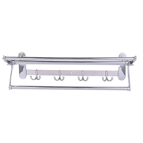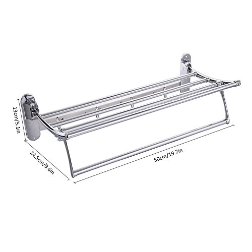 -. Feature : Product size(Approx.): 50*24.5*13cm/19.7*9.6*5.1in / Material: stainless steel / The foldable towel rack with flexible towel rod and fixed double-hook is for hanging more items such as bath towel, towel, clothes, hats, umbrellas, etc. / Designed to be universal, it is suitable for shower room, living room, bedroom and so on. / It is full-equipped and easy to use for direct installation.