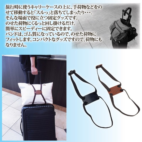 旅行時に使うキャリーケースの上に、手荷物などをのせて移動すると「スルっ」と落ちてしまったり・・・。そんな場面で役に立つ固定グッズです。のせた荷物にくるっと回し掛けるだけ。簡単にスピーディーに固定できます。バンドは、ゴム質になっているので、のせた荷物にフィットします。コンパクトなグッズですので、荷物にもなりません。