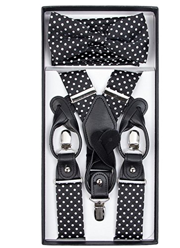 -. Feature : Men's Black & White Design 3 PC Clip-on Suspenders, Bow Tie and Pocket Square Set / Suspender Straps width are approximately: 1 3/8 inches (3.5cm) and Classic Y-shape suspenders are a unique and stylish fashion accessory / Suspenders 6 Button holes attach to buttons (included) on your pants, trousers, or other clothing.Three Metal Clips allow for adjustable length / Bow Tie is Pre-Tied Dimensions are 5.25"L x 2.5"H / Pocket Square measures 10" x 10"