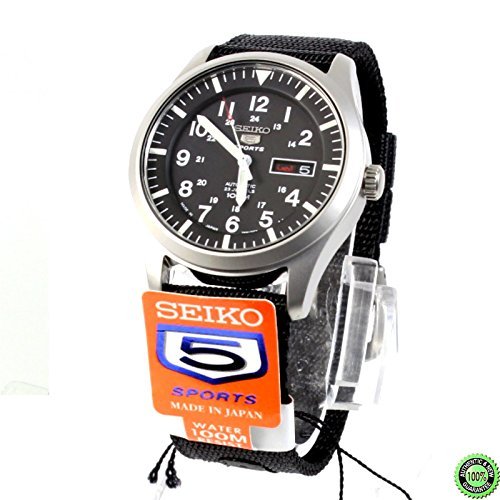 Stainless steel case with a black / blue nylon strap. Fixed stainless steel bezel. Black dial with luminous hands and Arabic numeral hour markers. 24 hour markers. Minute markers around the outer rim. Dial Type: Analog. Luminescent hands and markers. Day of the week and date display at the 3 o'clock position. Seiko caliber 7S36 automatic movement with a 40-hour power reserve. Scratch resistant Hardlex crystal. Pull / push crown. Transparent case back. Case size: 42 mm. Case thickness: 12 mm. Round case shape. Band width: 22 mm. Tang clasp. Water resistant at 100 meters / 330 feet. Functions: date, day, hour, minute, second. Dress watch style. Seiko 5 Automatic Black Dial Mens Watch SNZG15J1.