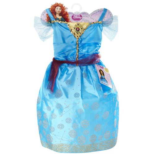 Look just like Merida! This gorgeous, glittery dress shimmers and shines with every step. Merida's Enchanted Evening dress features gold glitter accents and two-tone fabrics. This dress is perfect for your little Disney Princess.