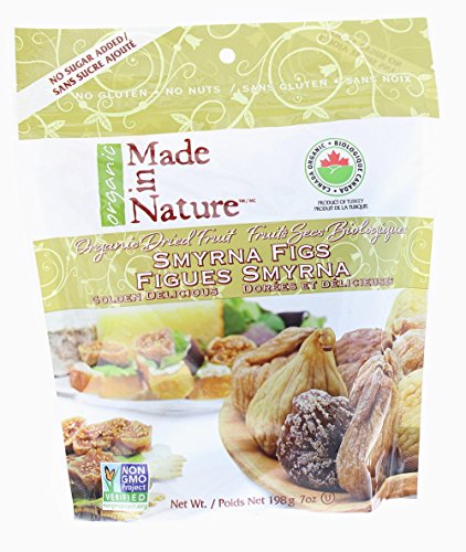 -. Feature : Made in Nature Organic Smyrna Figs are all natural, golden and delicious! / These delectable golden Smyrna figs are sun-dried to perfection with a soft, tan, delicate skin, moist flesh and the right balance of sweet and nutty flavors. / Contains no gluten, no nuts, and not added sugar. / Resealable bag for easy storage. / For best results refrigerate after opening.