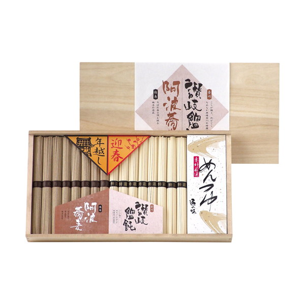 ●厳選したそばの実を製粉し挽きたての風味を大切に作り上げた阿波そばは、冷やしても、温めても美味しく食べることができます。讃岐うどんは、「粘り」と「弾力性」を備えた「コシ」の強いうどんとして定評があります。めんつゆも付いていますので、手軽にいただくことが出来る、「年越しソバ」と「迎春うどん」と「めんつゆ」の詰合せです。