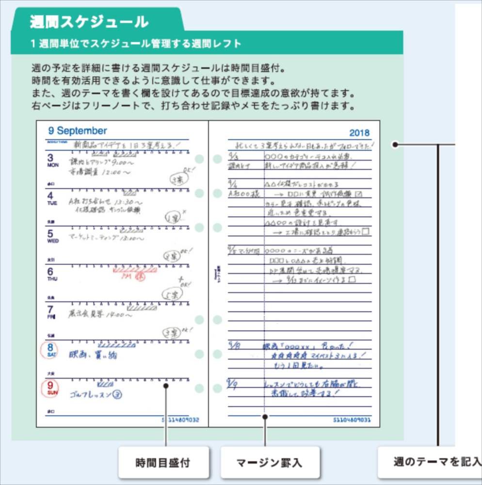 The weekly schedule is a left formula with the notes column on the schedule column on the left page and the memo field on the right page.
