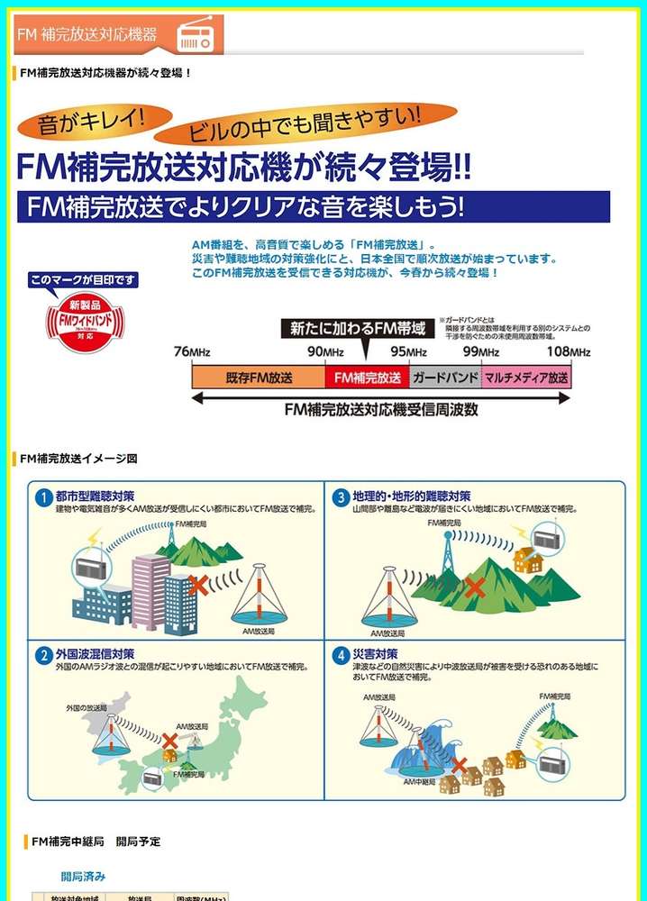 ●※FM補完放送とは、AMラジオ放送の対象地域において、放送区域内の災害対策や難聴対策のためにFMの周波数を利用して、補完的にAM番組を放送することです